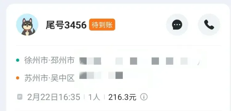 25日下昼,封面新闻记者连络上发帖东说念主。他自称姓侯,2月21日,他从山东自驾回上海,通过某顺风车平台接了两单顺道单。“其中一单是一位男士,年事约莫40多岁,肇端点是从徐州到苏州。因为春节堵车,全程开了11个小时,平台方扣除手续费后,这单到我手里是216.3元。”